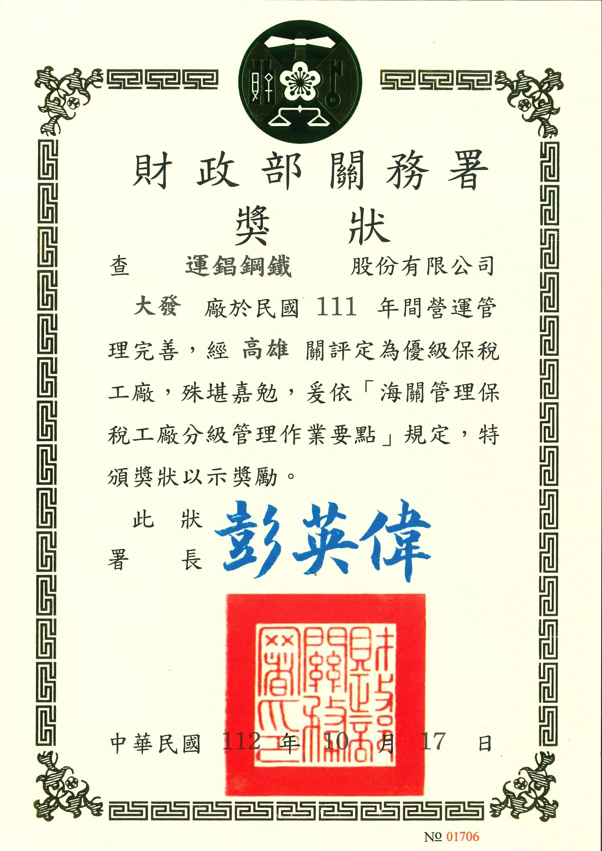 大發廠榮獲財政部關務署頒發111年優級保稅工廠